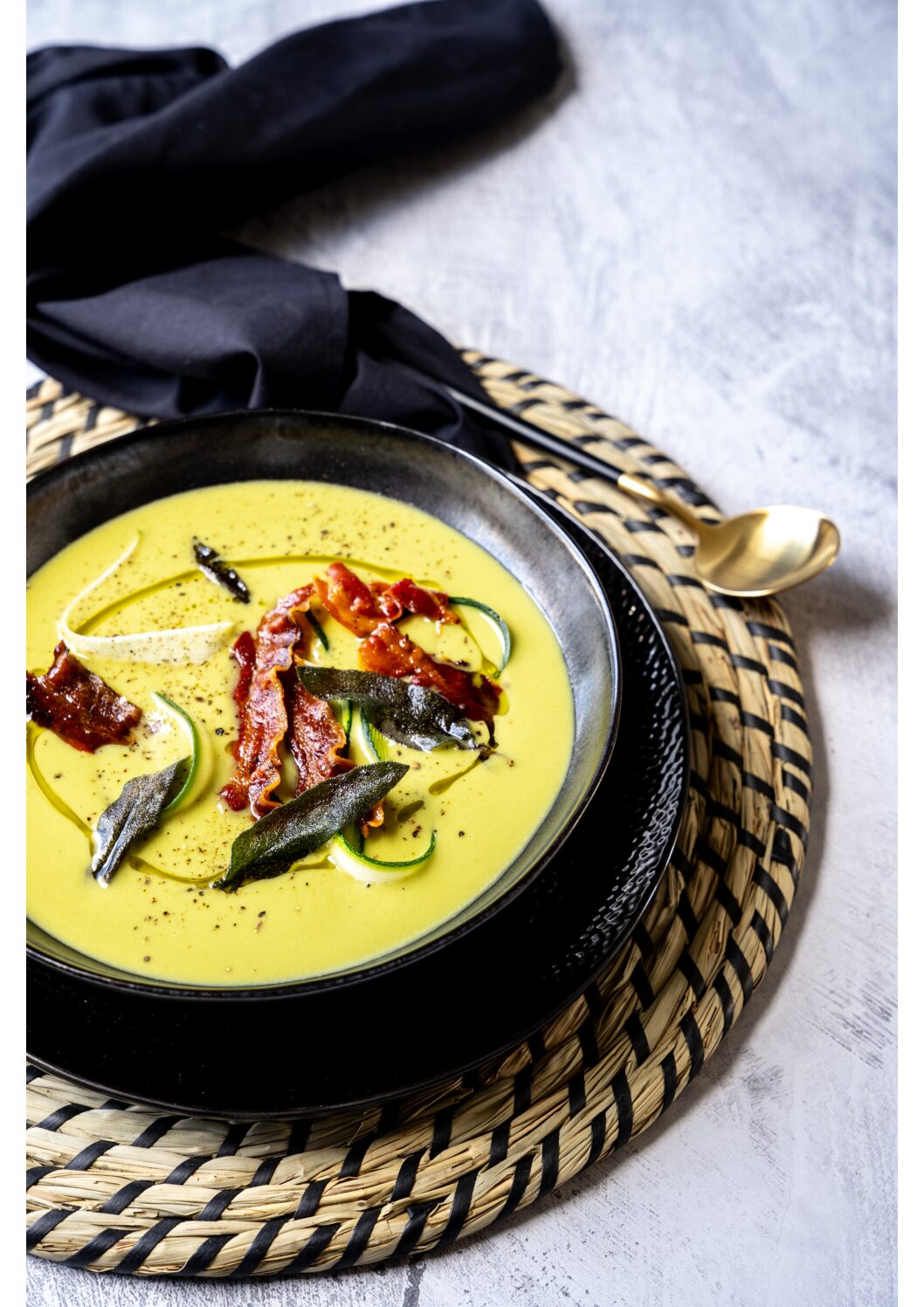 - Serveer de soep en dresseer het bord met het spek, salie, eventueel met wat extra sliertjes courgette en enkele druppels olijfolie.